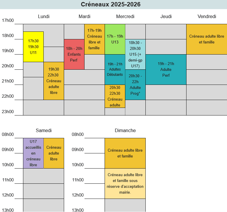 Les créneaux hebdomadaires dont le club dispose au Gymnase Laroche hors vacances scolaires sont décrits ci-dessus :